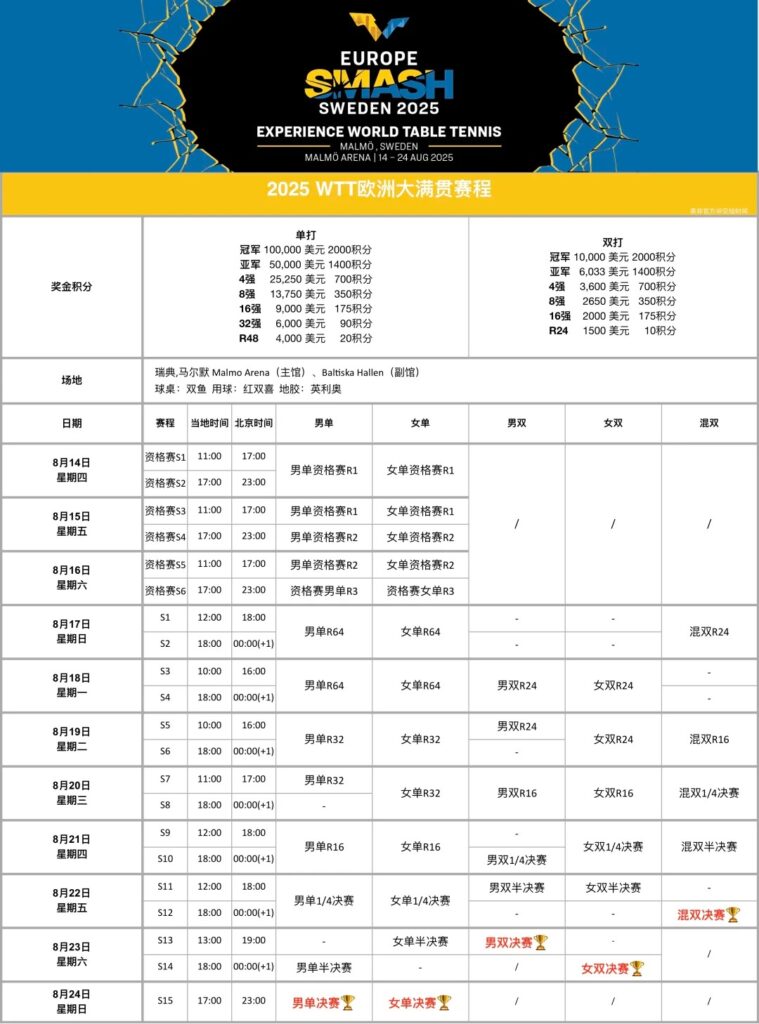 2025年WTT欧洲大满贯将在瑞典马尔默体育馆举行,赛事将从8月14日持续至24日。赛事的具体赛程安排已公布,其中男子单打和女子单打的资格赛将于8月14日和15日举行。随着比赛的推进,混合双打、男子双打和女子双打的比赛也将在8月17日后展开。