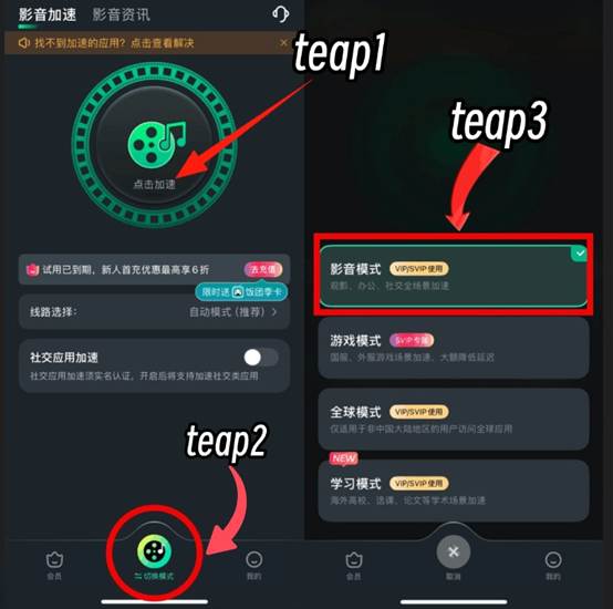 ②切记兑换完之后,才可以到下方切换模式,找到【影音模式】加速即可!返回进入【观看平台】即可观看!