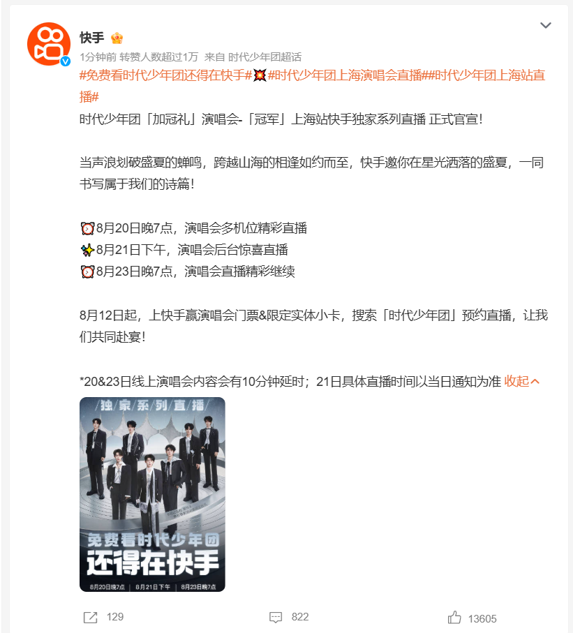 自 2020 年入驻以来,时代少年团与快手共同创造了多个直播纪录:出道五周年演唱会直播累计观看超 4.4 亿人次,单场最高同时在线 337 万。此次「加冠礼」系列直播,快手更准备了:直播专属表情包与特效滤镜;成员手写祝福电子明信片;直播弹幕互动彩蛋(触发关键词解锁隐藏福利)