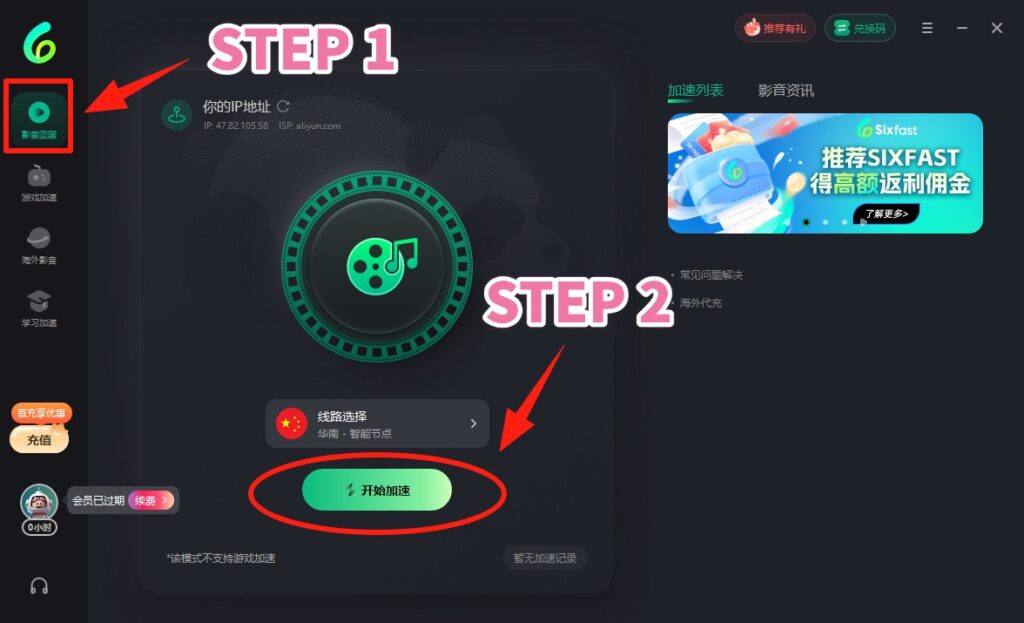 记得先兑换然后再左边找到【影音回国】-点击【开始加速】