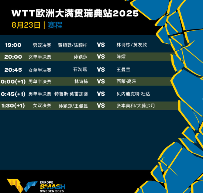 今晚8.23 晚7.30起,将会是wtt瑞典大满贯男女双决赛和男单,女单的半决赛,以下是今日比赛赛程表