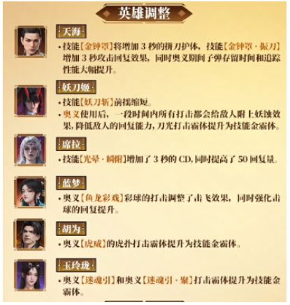 本赛季将对多个英雄进行平衡性调整,包括天海、妖刀姬、席拉、蓝梦、胡为、玉玲珑等。新加入的蓄力收益天赋,也将为玩家提供更多的玩法选择。而完美闪避的天赋也进行了优化,操作更加精准!