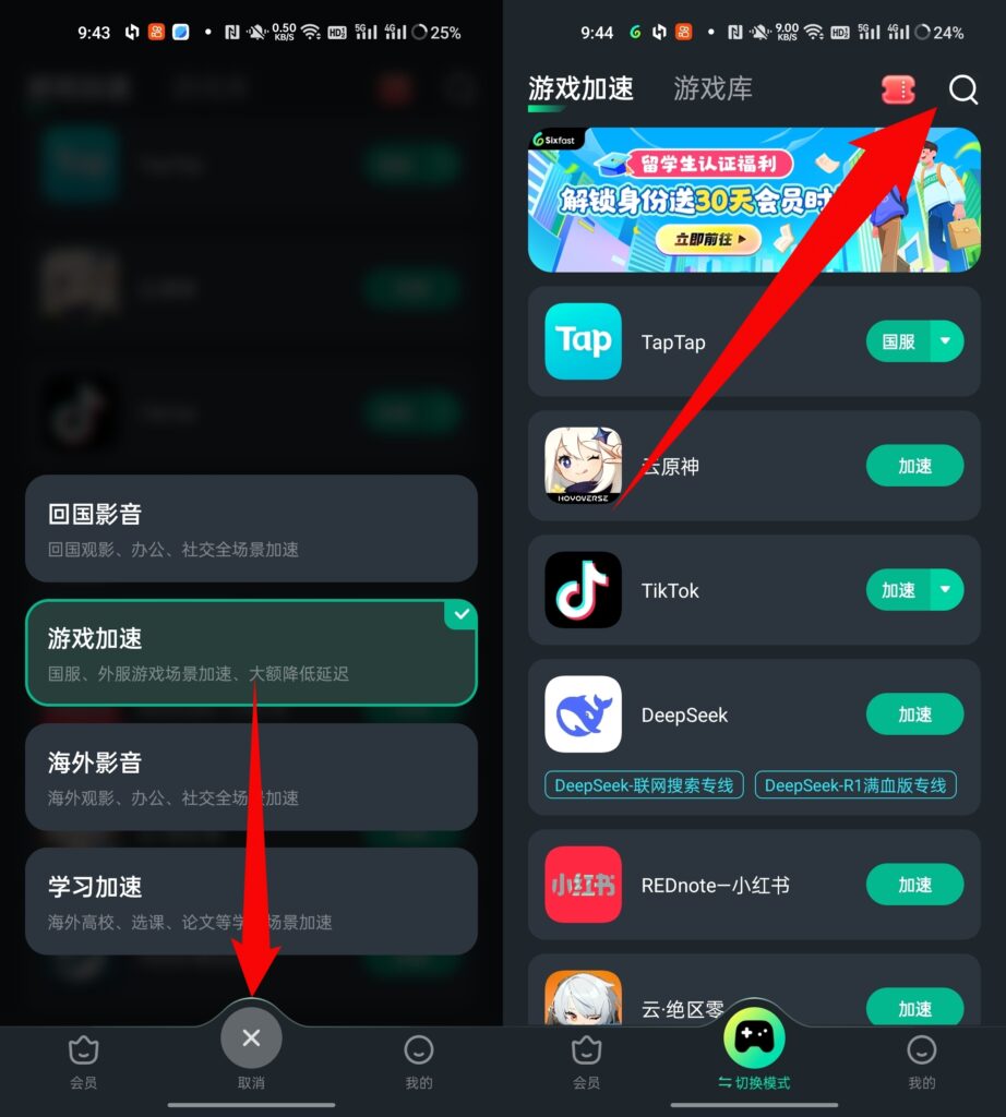 ②兑换完之后,下方切换模式,找到【游戏模式】,右上方搜索【游戏名称】-点击加速,也可以搜索其他国服游戏,流畅无卡顿畅玩!