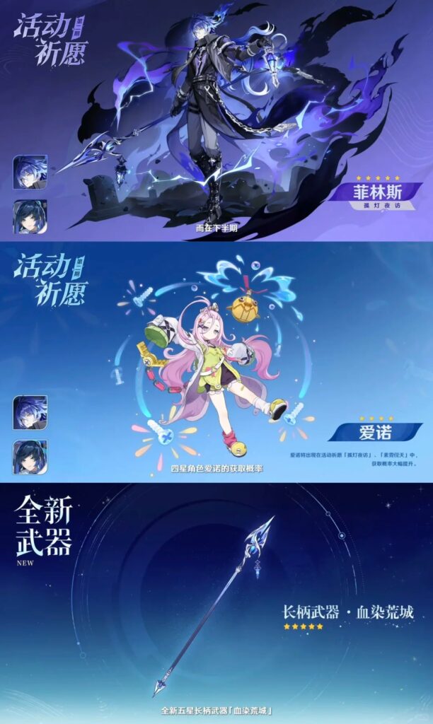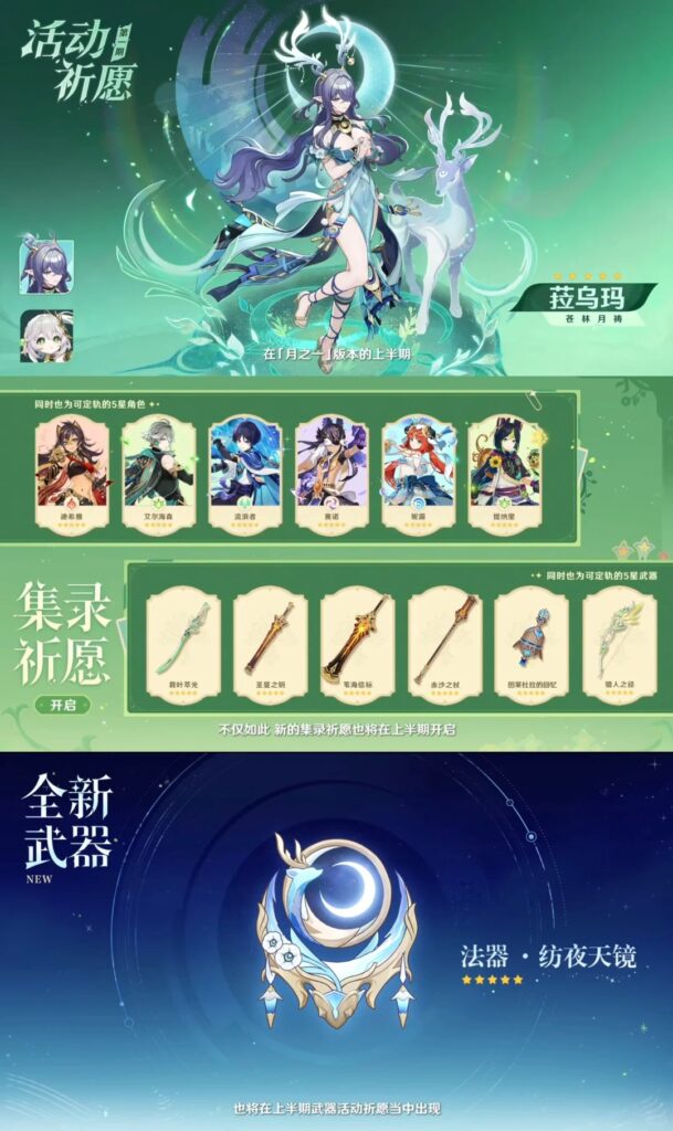 卡池 上半:菈乌玛 +纳西妲+须弥混池 下半:菲林斯+夜兰(爱诺四星水系,剧情和机械对话赠送)