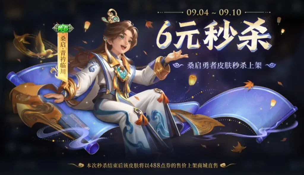 【桑启-青衿临川】全新秒杀皮肤即将上线!这次,桑启化身为三国天才少年曹植,才高八斗,意气风发。身着蓝白祥云服饰,随身佩戴有诗集与宝剑,尽显少年心气与书香才情。