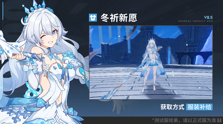 在即将到来的8.5版本中将新增咚!炽愿吉星适用服装「冬祈新愿」、瞒天乐游·曙影适用服装「云浪快心」、女武神·重机适用服装「智慧大魔王」。