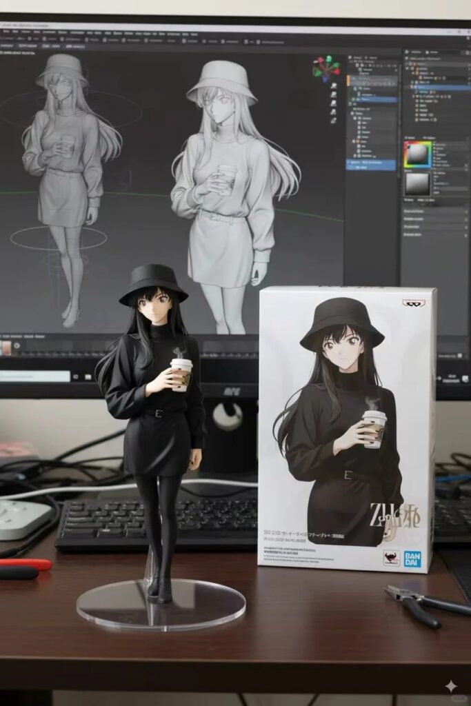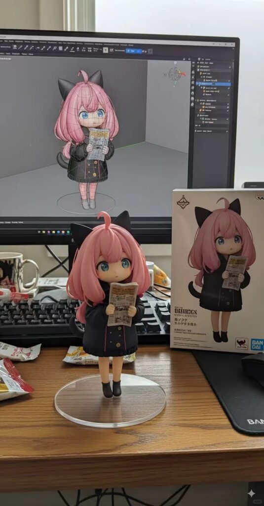 提示词:Prompt : photo into a character figure. Behind it, place a box with the character’s image printed on it .Next to it, add a computer with its screen showing the Blender modeling process. In front of the box, add a round plastic base for the figure and have it stand on it. The PVC material of the base should have a crystal-clear, translucent texture, and set the entire scene indoors.