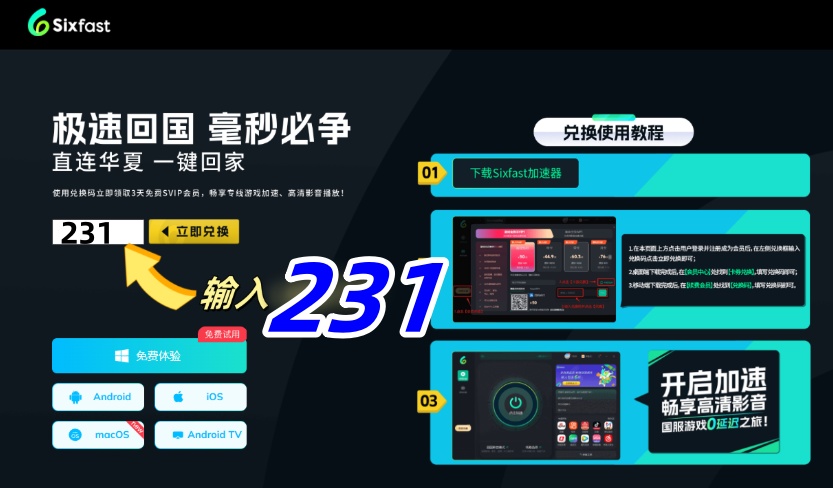 也可以直接点击:https://www.sixfast.com/tg-exchange 按照下图所示填写兑换码【231】,并按照右边步骤注册登录Sixfast,领取时长。(支持手机和电脑)
