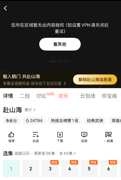 《赴山海》作为中国大陆的热播剧,其播放权属于腾讯等平台,而这些平台的国际版权限可能并不覆盖韩国。许多海外平台在某些地区可能因为版权问题,无法提供该剧集的播放服务,导致韩国地区的观众无法收看。 - 地理区域限制: