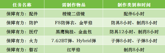 本赛季3X3任务中需要在特勤处制作一系列物品,具体需求如下: