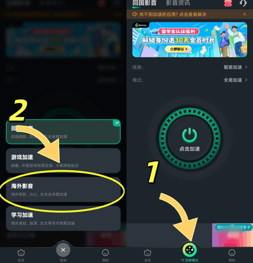 ②兑换完之后,才可以到下方【切换模式】,找到【海外影音】,选择一个能正常使用WhatsApp的国家(如:英国、加拿大)点击加速就可以正常使用了!