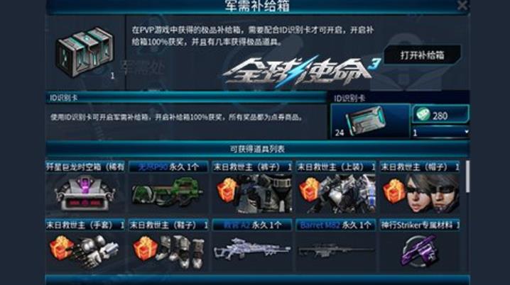 军需补给箱是为了鼓励那些热衷于PVP对抗的玩家而专门设立的奖励系统。在PVP游戏中每次击杀对手都有几率获得军需补给箱。需要注意的是,补给箱默认为加密状态,需要使用“ID识别卡”打开,该道具不仅商城有售,平时还将通过活动免费发放给广大玩家。使用ID识别卡即可开启军需补给箱。开启军需补给箱100%获奖,所有奖品都为点券商品。除了数十种永久武器装备外,更有机会获得带属性的游戏。