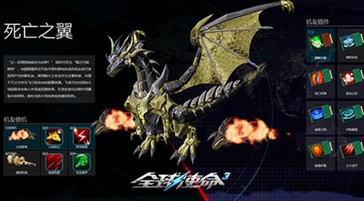 活动期间,玩家开启“军需补给箱”就有几率获得紫色品质的机友。作为《全球使命3》独创的类宠物伴侣系统,机友可在PVE模式中可以跟随玩家共同战斗。“让一切罪恶统统化为灰烬!” 项目代号为“钢之巴哈姆特”,死亡之翼由国联精英空天技术部对原有的龙形机友进行改造而产生的新机友。使用熔火之合金作为主要材质,内置不灭之火作为飞行和攻击的能量来源。飞龙可吐出高热火球追踪攻击敌人并造成范围伤害。巨龙在进化过程中羽翼渐丰的同时,喷吐出的火球也将变的越发炽热。