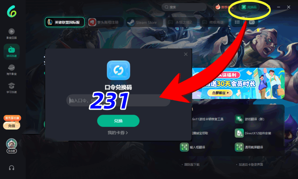 右上角【兌換碼】- 輸入【231】- 領取免費時長!兌換完成後才可以加速!!!