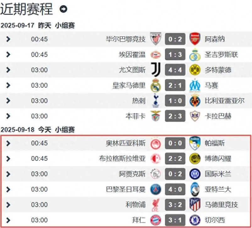 欧冠联赛阶段第一轮第二日的6场比赛已经全部战罢,其中四大豪门均取得开门红,卫冕冠军巴黎、拜仁、国际米兰都是轻取对手,而利物浦爱上了绝杀