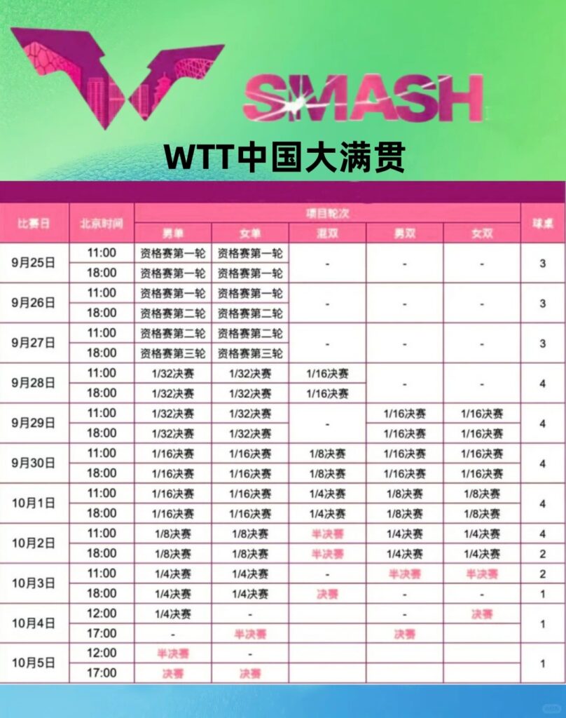 2025年WTT中國大滿貫是世界乒乓球職業大聯盟(WTT)舉辦的最高級別乒乓球賽事,於9月25日至10月5日在北京石景山首鋼園舉行,這也是2025年WTT大滿貫賽的最後一場比賽。以下是本次比賽賽程: