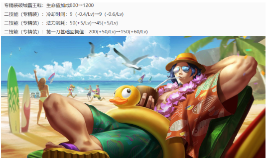 项羽专精装加强:专精装血量增加,2技能蓝耗降低,2技能CD减少,2技能前期回血量降低。(这件专精装已经上线抢先服,将在下周上线正式服内)
