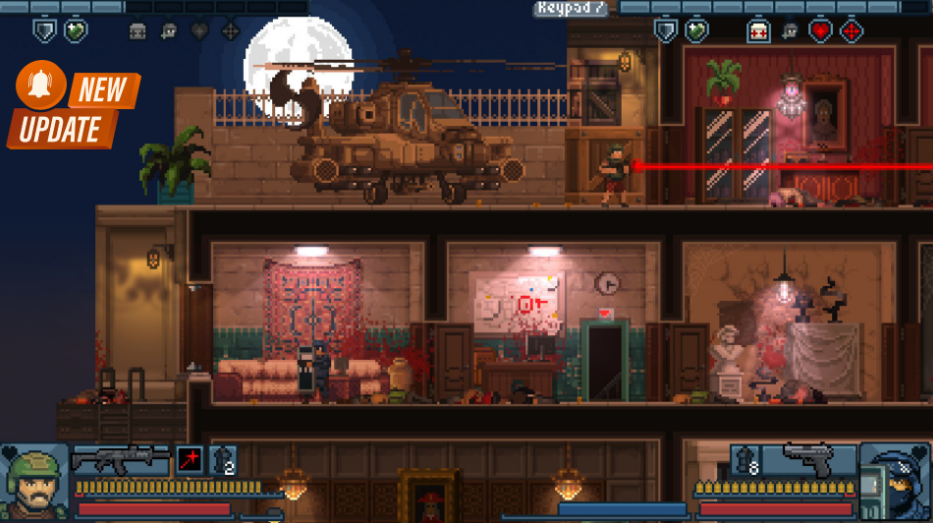 《破门而入:行动小队》是一款将策略规划、实时战斗与高自由度战术设计相结合的像素风游戏。在游戏中,玩家将化身为一名特警队员,进入充满未知威胁的室内环境,执行包括解救人质、拆除炸弹、击毙恐怖分子等高风险任务。