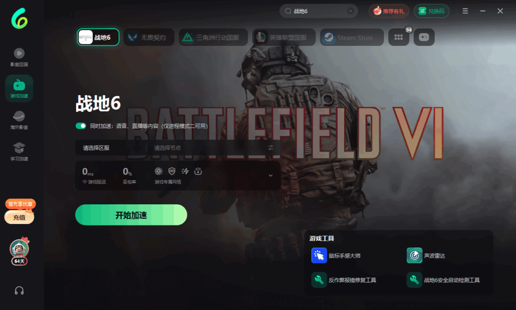 之后再游戏库内搜索战地6,然后点击加速,就可以正常解决战地六登陆失败等网络问题