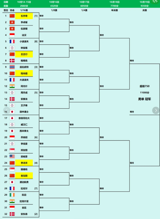 - 男单:石宇奇、李诗沣、翁泓阳、陆光祖、王正行五位选手携手出战,其中石宇奇和李诗沣具备冲击领奖台的实力,他们将面临来自丹麦本土名将安赛龙、印尼选手金廷等强手的挑战;