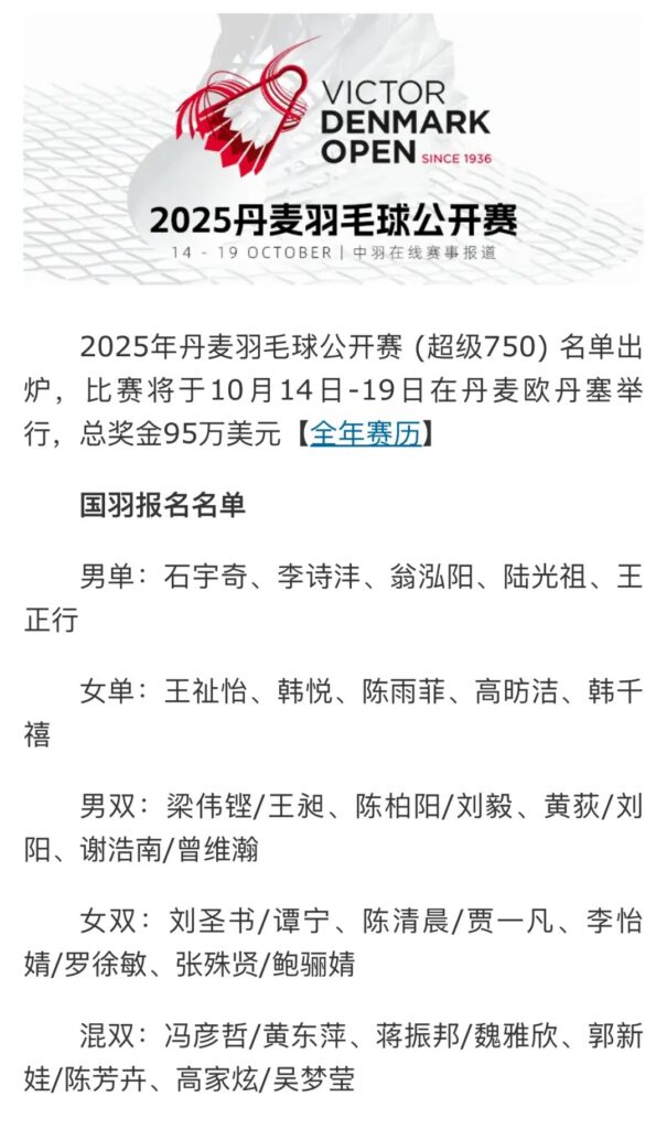 如今,丹麦公开赛依旧是检验选手实力的重要舞台。丹麦本土选手安赛龙作为现任男单世界排名前列的选手,将在家乡观众的助威声中向冠军发起冲击,而国羽新一代选手则肩负着传承荣耀、再创佳绩的使命,他们与世界强手的较量将成为本届赛事的一大看点。