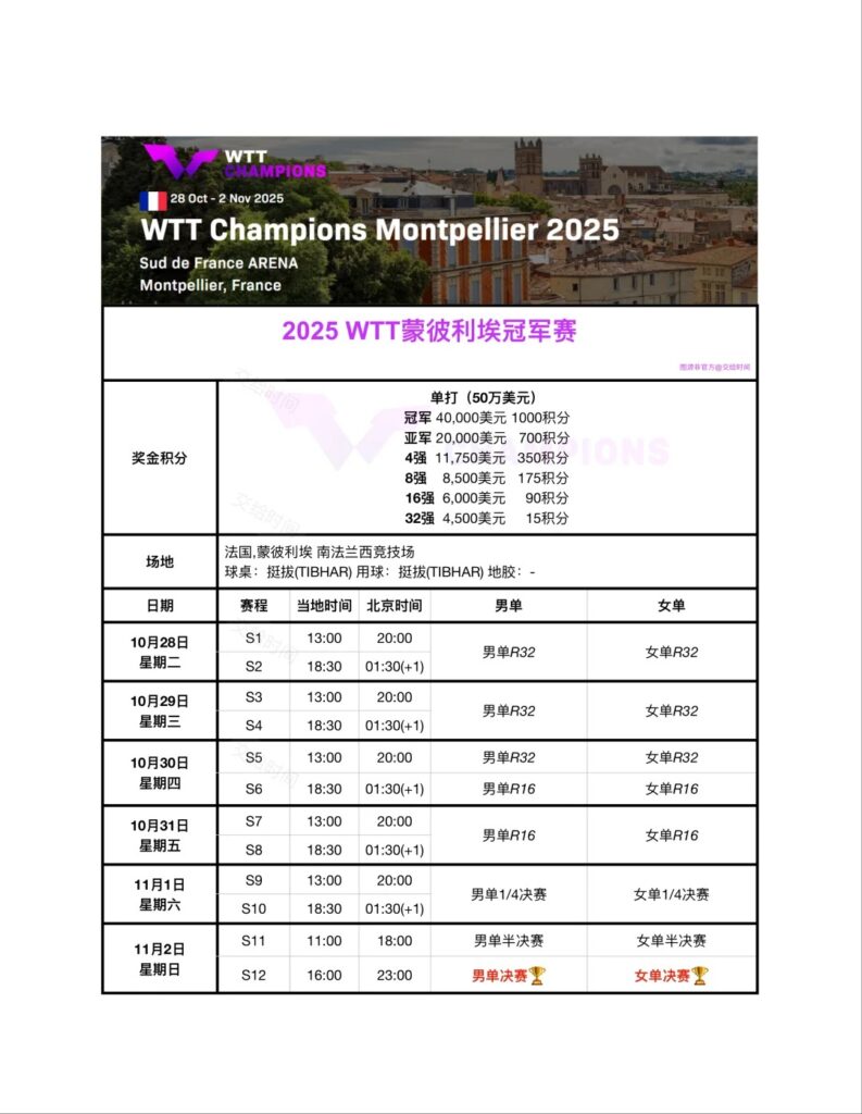 WTT冠军赛是仅次于大满贯的全球第二级别乒乓球赛事,其积分与奖金体系对选手的职业发展至关重要。2025蒙彼利埃站赛事延续了该级别赛事的核心配置:
