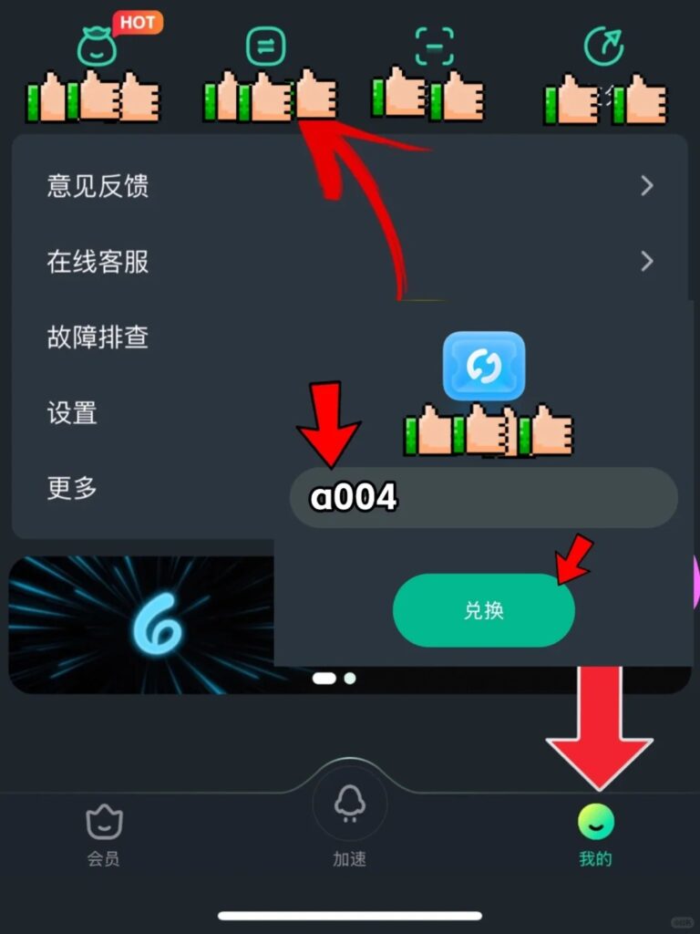 2、下载好后按照提示登录注册,在会员中找到【兑换码】,使用【230】先领取时长,才能使用软件,也可以直接点击:https://www.sixfast.com/tg-exchange 按照下图所示填写兑换码【230】,并按照右边步骤注册登录Sixfast,领取时长。
