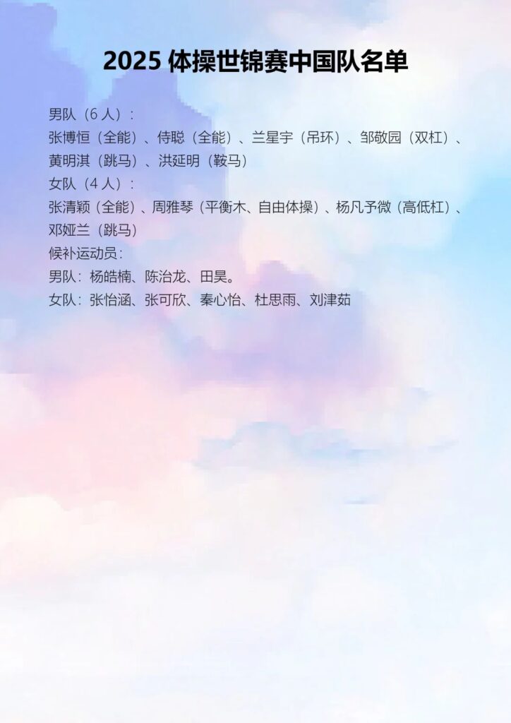 女队的冲金点主要是周雅琴的平衡木,巴黎奥运会银牌得主周雅琴在平衡木上还是具有冲击金牌的实力,但平衡木项目偶然性很大,因此临场发挥也尤为重要。 高低杠杨凡予微将出战,在2025年世界杯安塔利亚站高低杠决赛中,她完成了一个难度极高的“直体叶格尔空翻转体360度”,并被国际体联以她的名字命名为“杨凡予微空翻”。奥运会金牌得主凯利娅·内穆尔将是这个项目她的最大竞争对手。 跳马项目邓娅兰出战,在该项目上也有冲击奖牌的实力。 女队的全能派出张清颖,在2025年全国锦标赛上,她以54.333分的优异成绩夺得个人全能冠军。张清颖四个单项较为均衡,但和国际顶尖水平还是有一定差距。