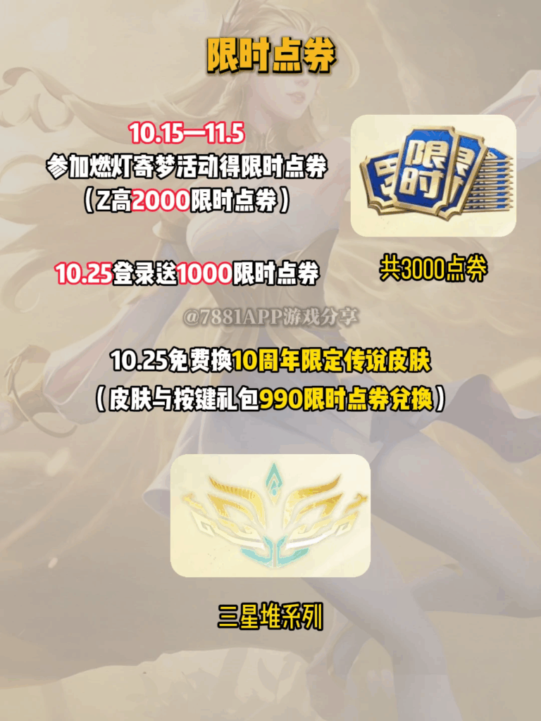 除了免费皮肤之外限时点券活动也是本次庆典的重头戏,今年周年庆的限时点券活动可能会升级,将会开放更多皮肤可以用限时点券购买。从八月下旬开始王者荣耀就已经推出了限时点券活动,玩家通过完成任务最多已可获得1010限时点券。