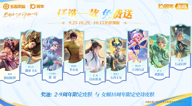 - 周年皮肤免费送 :免费获得女娲史诗皮肤「万灵启世」或往期周年限定皮肤 活动持续至10月29日