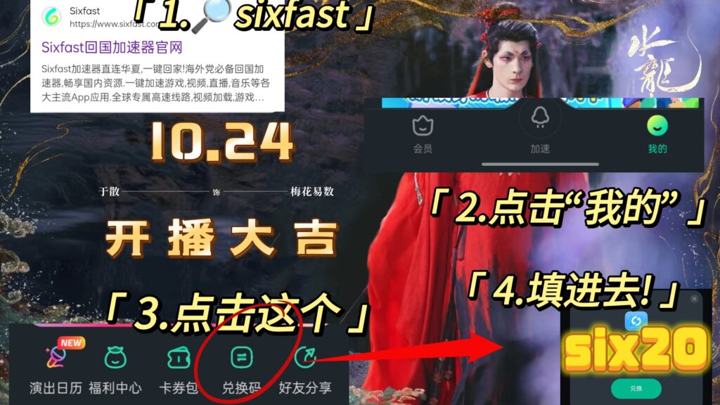 也可以直接点击:https://www.sixfast.com/tg-exchange 按照下图所示填写兑换码【six20】,并按照右边步骤注册登录Sixfast,领取时长。(支持手机和电脑)
