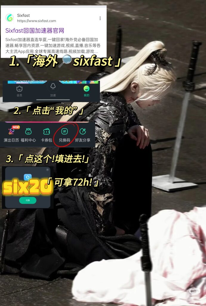 也可以直接点击:https://www.sixfast.com/tg-exchange 按照下图所示填写兑换码【six20】,并按照右边步骤注册登录Sixfast,领取时长。(支持手机和电脑)