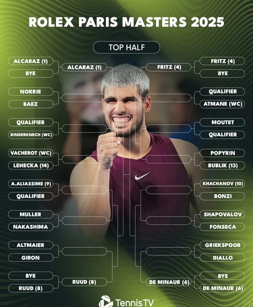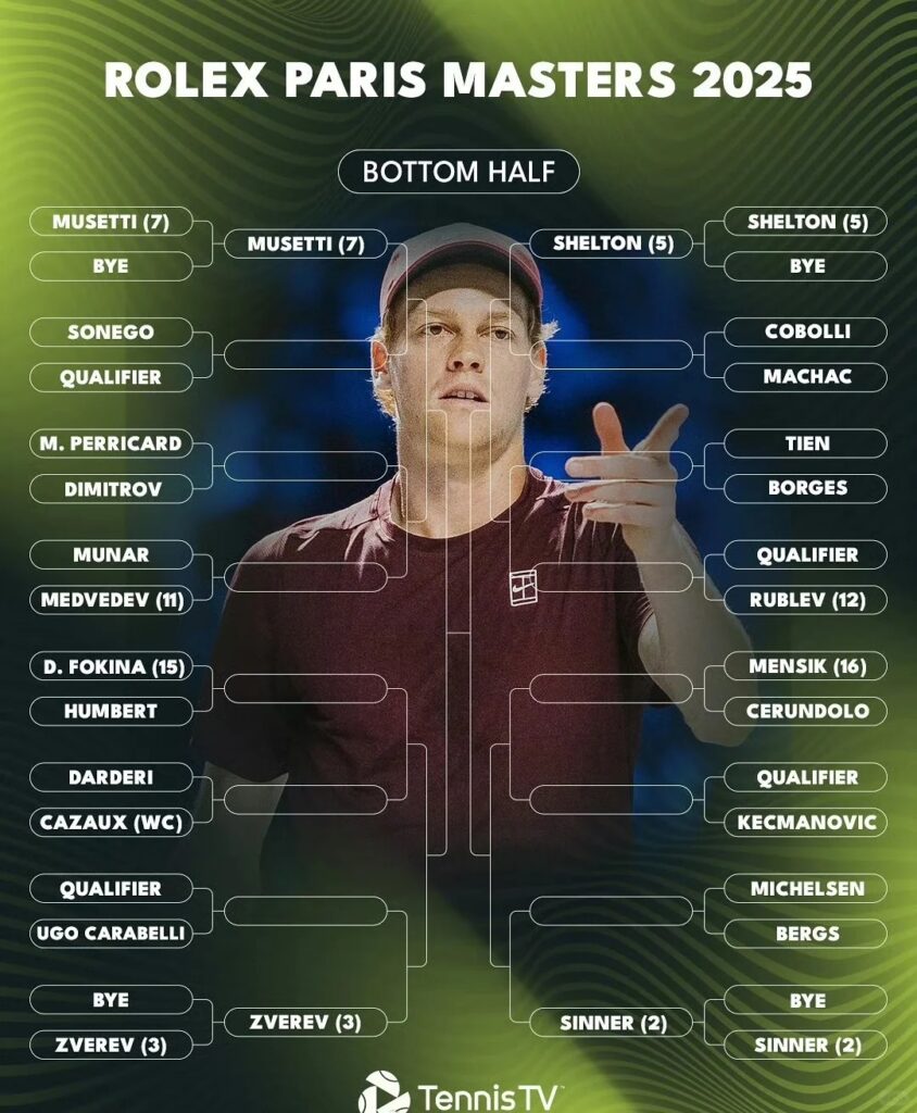 · 第三轮:莱赫卡 / 瓦舍罗 / 林德克内希 · 四分之一决赛:鲁德 / 阿利亚西姆 · 半决赛:弗里茨 / 德米纳尔 / 卡恰诺夫 / 布勃利克 · 决赛:辛纳 / 兹维列夫 / 穆塞蒂 / 谢尔顿
