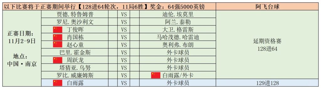 本届赛事由世界职业比利和斯诺克协会、中国台球协会联合主办,南京市体育局等单位承办,赛事周期横跨8天。资格赛阶段已于9月30日至10月2日在英国谢菲尔德完成大部分赛程,而丁俊晖、赵心童等顶尖选手的资格赛则延期至正赛期间举行,确保了正赛阶段从首日起就充满看点。