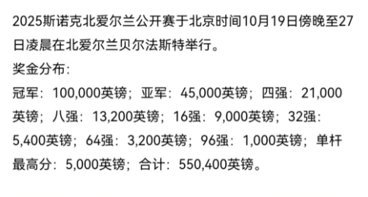 作为首个在英国本土之外举办的世界最高级别斯诺克锦标赛,本届赛事总奖金提升至82.5万英镑,其中冠军奖金高达17.5万英镑,亚军可获得7.5万英镑,单杆最高分奖金为5000英镑。从64强到冠军的各阶段奖金梯度设置,既保障了参赛选手的基本收益,也极大激发了顶尖选手的竞争欲望。