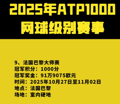 赛事总奖金池达612.894万欧元,单打冠军将获得94.661万欧元奖金和1000个ATP积分,亚军则收获51.6925万欧元和650积分。双打冠军组合可分得29.041万欧元及1000积分。对于仍在争夺年终总决赛席位的选手而言,本站赛事积分至关重要——目前排名ATP第8-12位的选手积分差距不足200分,巴黎大师赛的表现将直接决定谁能获得都灵年终总决赛的入场券