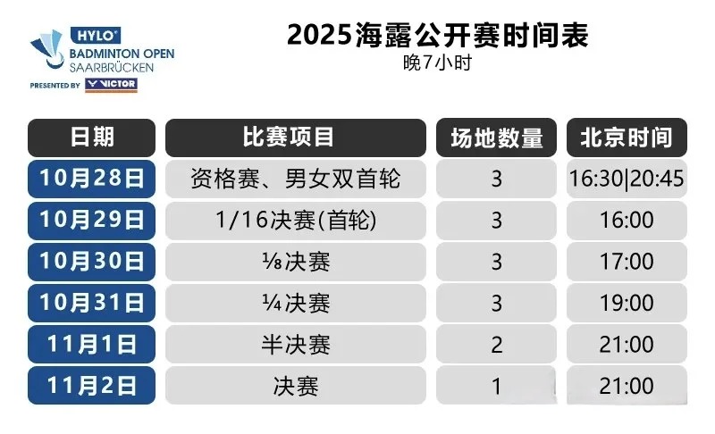 2025年德国海露羽毛球公开赛(Hylo Open)作为世界羽联(BWF)世界巡回赛超级500级别赛事,于10月28日至11月2日在德国萨尔兰州首府萨尔布吕肯的萨兰兰中心挥拍。作为本赛季欧洲羽毛球巡回赛的收官之战,本届赛事总奖金提升至47.5万美元,吸引了来自全球20余个国家和地区的顶尖选手参赛,同时因国羽全员缺席备战全运会,赛事格局呈现出多元化竞争态势