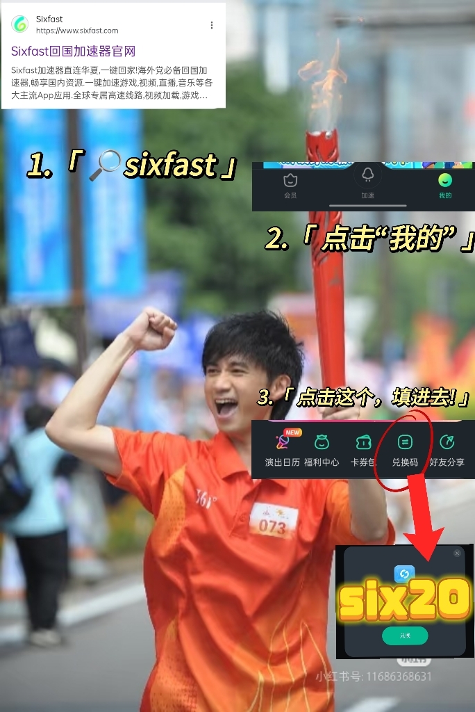 也可以直接点击:https://www.sixfast.com/tg-exchange 按照下图所示填写兑换码【six20】,并按照右边步骤注册登录Sixfast,领取时长。(支持手机和电脑)