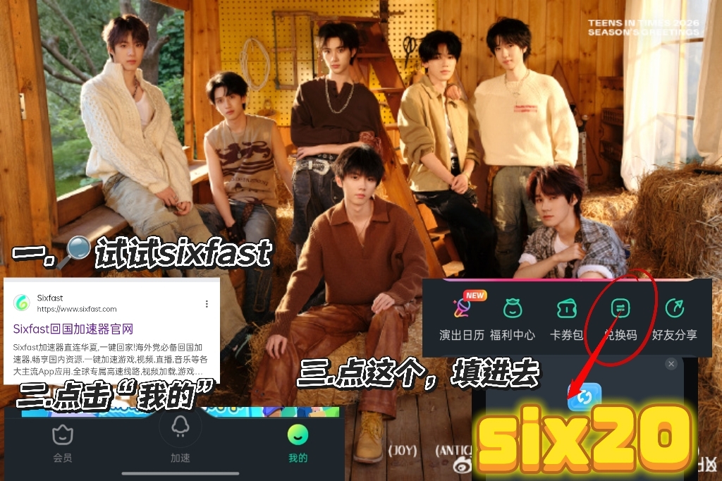 也可以直接点击:https://www.sixfast.com/tg-exchange 按照下图所示填写兑换码【six20】,并按照右边步骤注册登录Sixfast,领取时长。(支持手机和电脑)