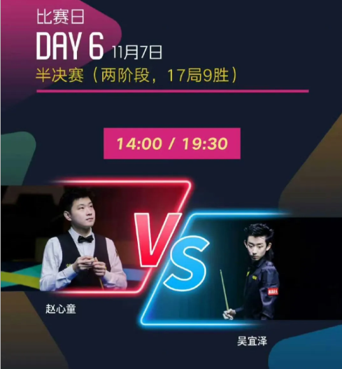 | 第一场半决赛 | 赵心童 VS 吴宜泽 | 11月7日 14:00 | 11月7日 19:30 |