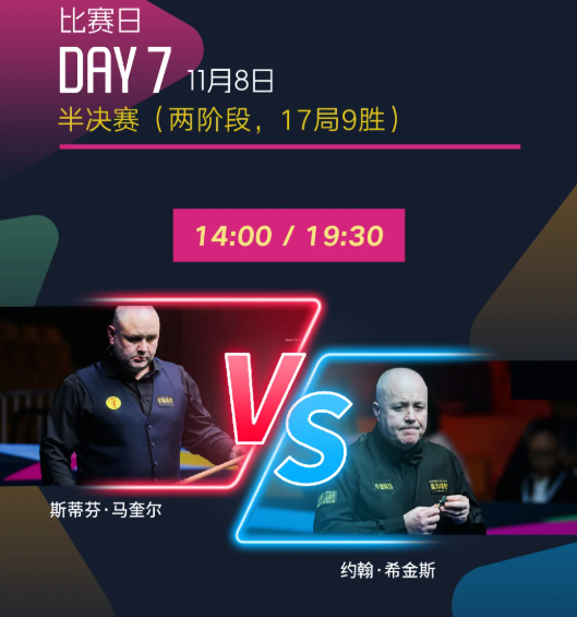 | 第二场半决赛 | 希金斯 VS 马奎尔 | 11月8日 14:00 | 11月8日 19:30 |