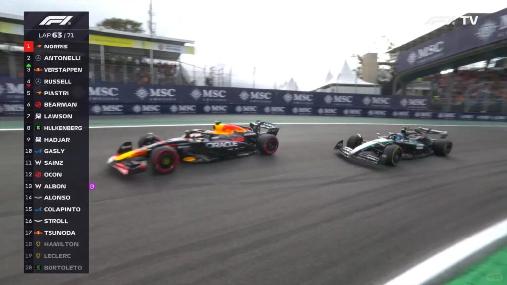 维斯塔潘成为本站最大亮点:他因排位赛成绩不佳选择从维修区起步,凭借出色的策略和驾驶技术持续发力,在第63圈于1号弯外线超越拉塞尔锁定领奖台席位,最终以0.3秒之差紧追安东内利获得季军。梅赛德斯新秀安东内利顶住压力,斩获职业生涯首个F1亚军;诺里斯则统治全场,继上一站后实现背靠背胜利,在车手积分榜上以9分优势领先皮亚斯特里,距离个人首个世界冠军再进一步。
