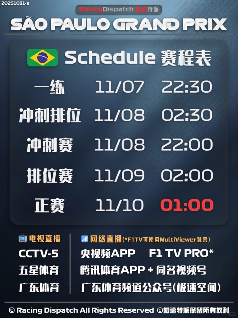 2025年圣保罗站首次启用F1全新冲刺赛周末 format,赛程安排紧凑且充满策略博弈: