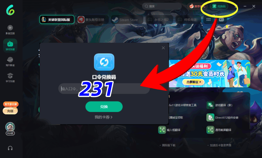 右上角【兑换码】-输入【231】-领取免费时长!兑换完成后才可以加速!!!