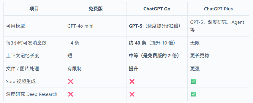 一句话总结: ChatGPT Go 就是 “日常够用版的 GPT-5”。日常写文案、查资料、翻译、编程、聊天、写报告——完全够用