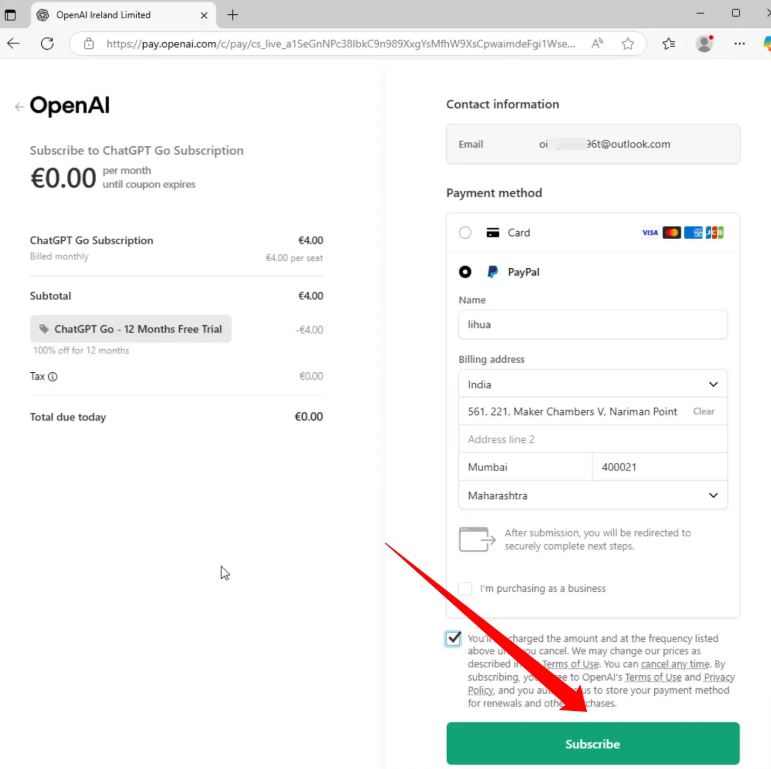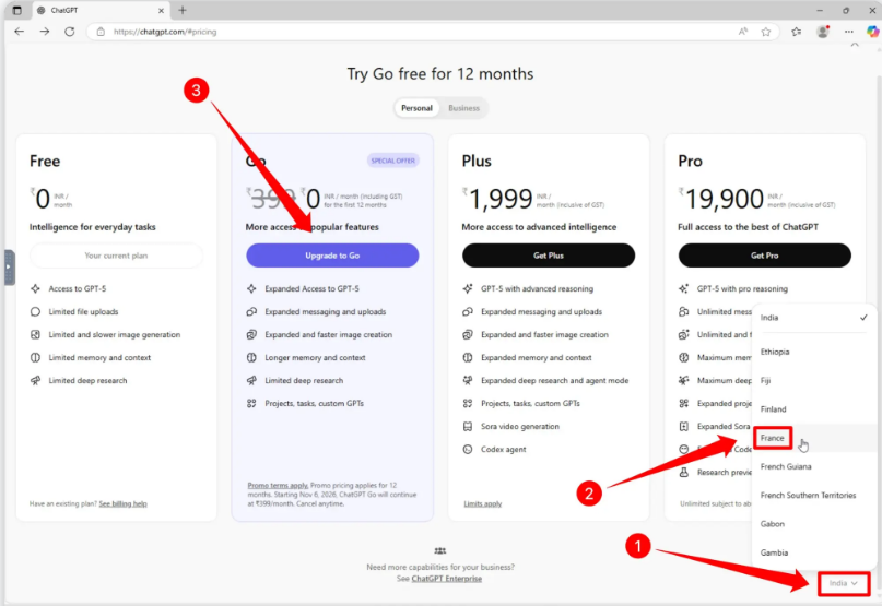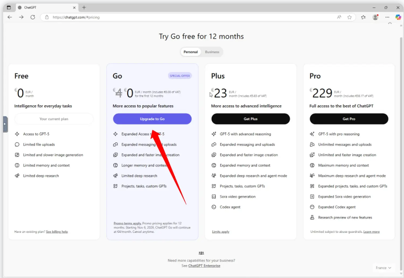 然后在欧洲区点击升级页面选择ChatGPT Plus 跳转了支付页面之后选择paypal选项,返回套餐页面,你会发现 ChatGPT Go 免费了