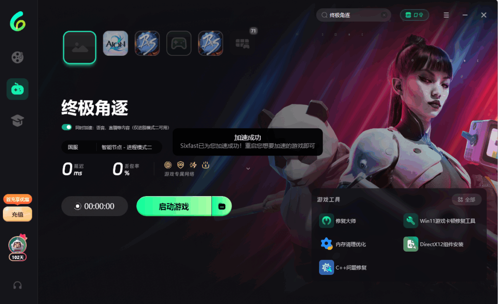 启动Sixfast后,在游戏库中找到《终极角逐》国服并开启加速。加速成功后,Sixfast会为您的游戏环境建立一个稳定的代理,有效绕开国际网络拥堵节点,直接将延迟从200ms+降低至50ms左右的理想水平,杜绝游戏内的瞬移和卡枪现象。