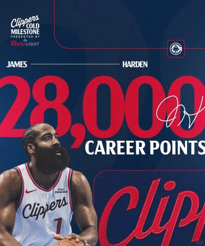 11 月 18 日快船 vs76 人,哈登首节狂砍 17 分,生涯总得分突破 28000 分跻身历史第 11 人,尽管最终快船 108-110 遭 13 分大逆转,但老詹的里程碑之夜依旧载入史册。​