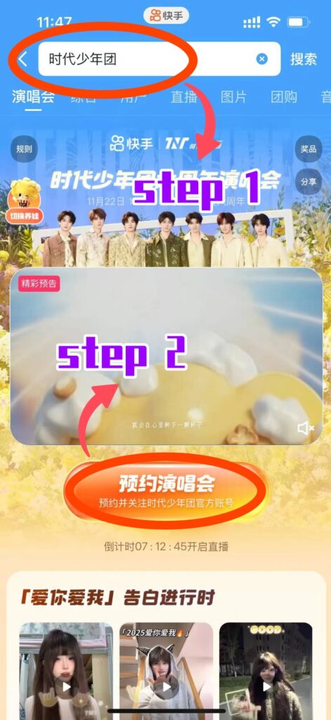 1.打开快手App,搜索“时代少年团”进入活动专题页。(海外粉丝会显示“此活动暂未对您所在地区开放”!)