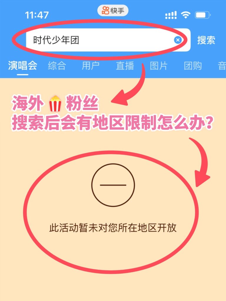 时代少年团六周年演唱会上线快手后,吸引了大批粉丝观看。然而,海外粉丝经常遇到看不了直播、无法发弹幕的问题,尤其是在新加坡、马来西亚、澳洲、香港等地区,IP限制让海外粉丝无法直接访问快手直播。这让许多海外粉丝感到焦虑,错过与偶像互动的机会。